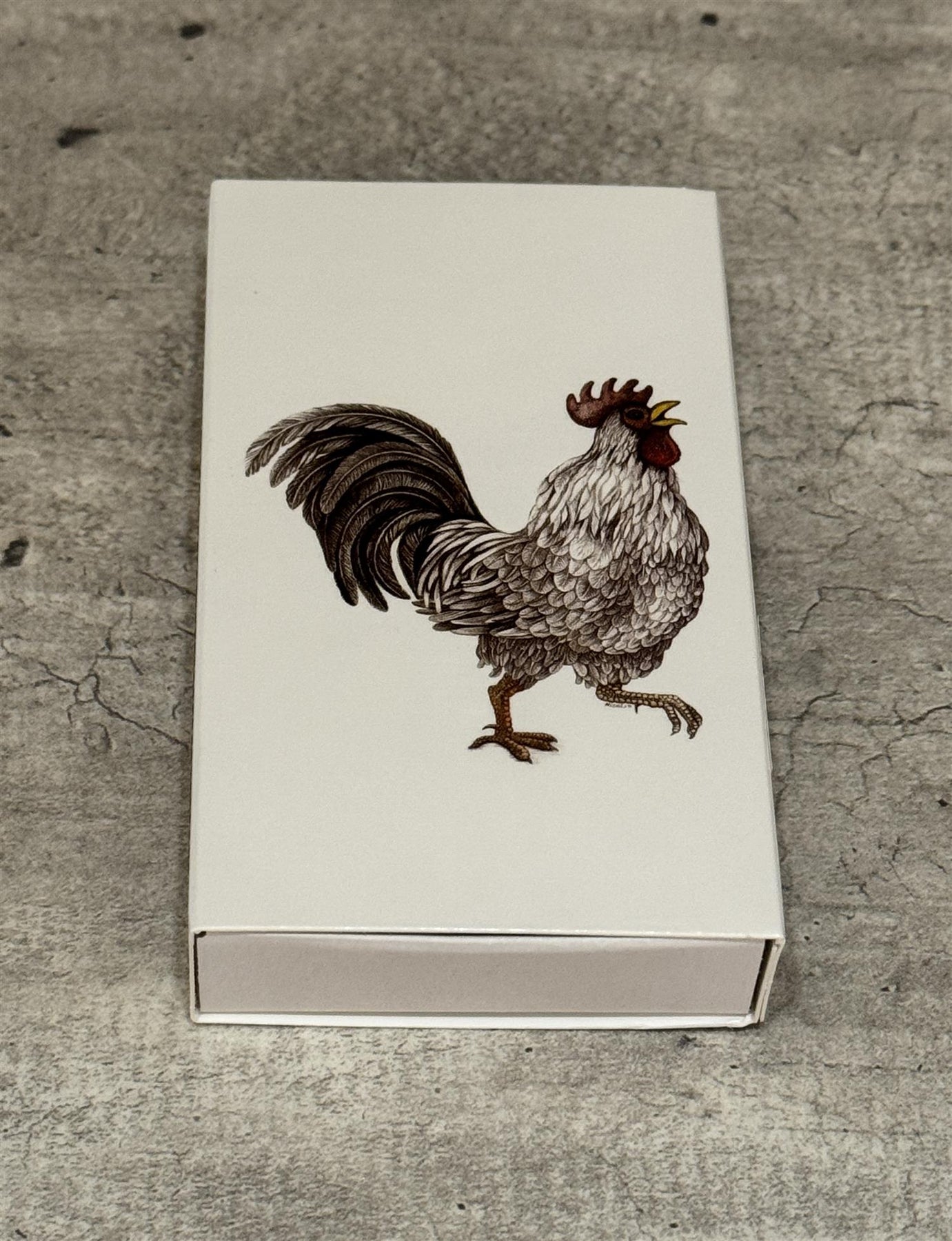 Fyrstikkeskene inneholder 45 ekstra lange fyrstikker som kan tenne flere lys på én gang. På denne esken har vi hane Ralph.