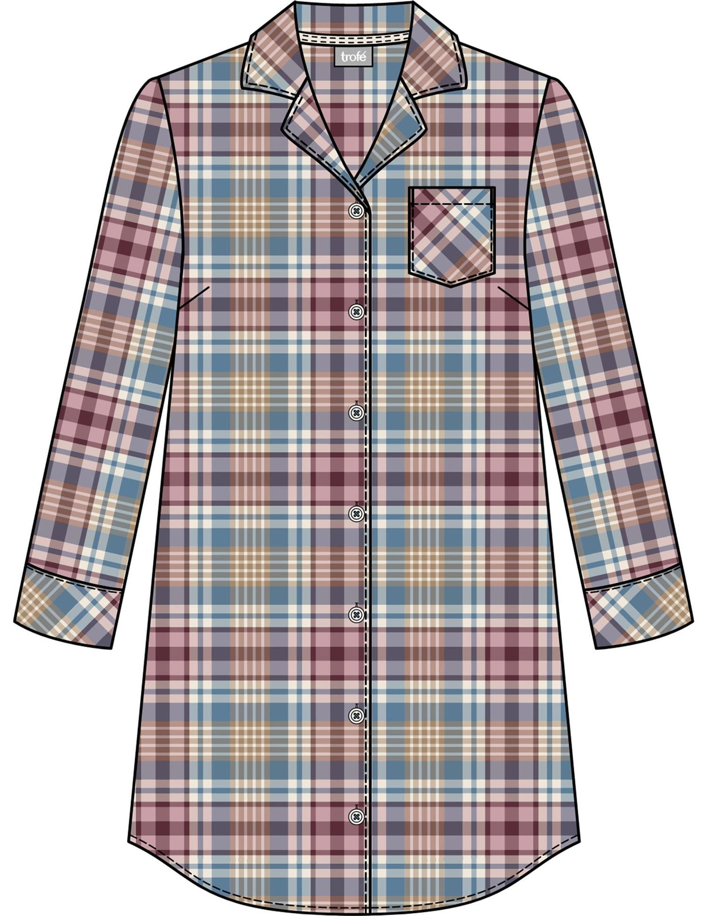 Sov godt og føl deg vel i Flannel Nightshirt fra Trofé. Denne pysjskjorten er laget i 100% børstet bomull som gir en lun og ekstra myk følelse mot huden. Med sitt tidløse rutemønster i rosa, vinrød, blå og beige på en frisk offwhite bunn, får den et koselig og klassisk uttrykk.