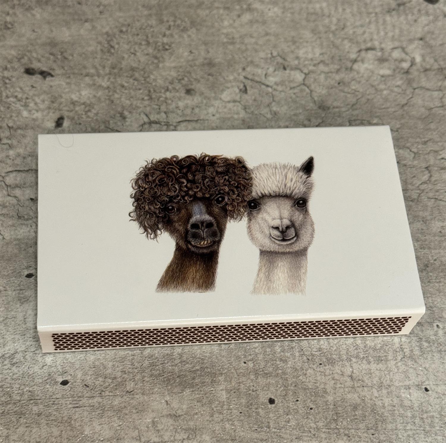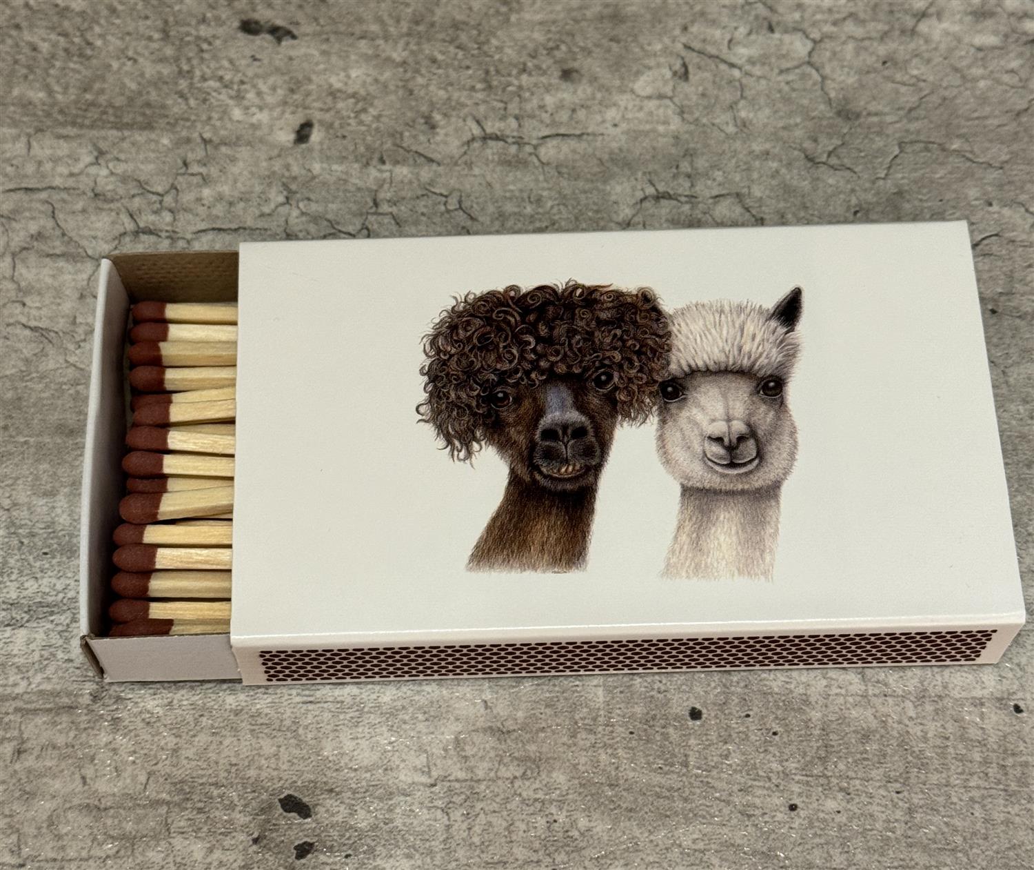 Fyrstikkeskene inneholder 45 ekstra lange fyrstikker som kan tenne flere lys på én gang. På denne esken har vi det populære alpakkamotivet Andersson.