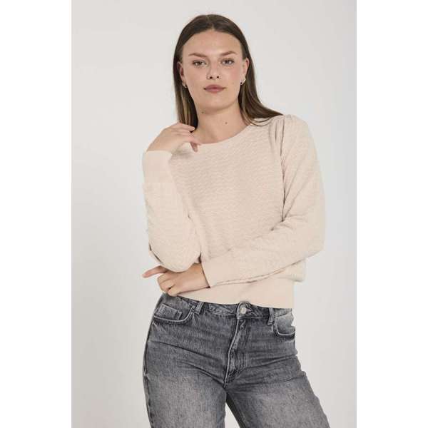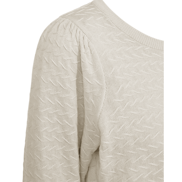 Laget i 100 % bomull, har den en tykk og klassisk bomullsstrikk som gir både komfort og struktur. Med rund hals, lange ermer og en diskré puff ved skuldrene, kombinerer den det klassiske med et hint av femininitet.