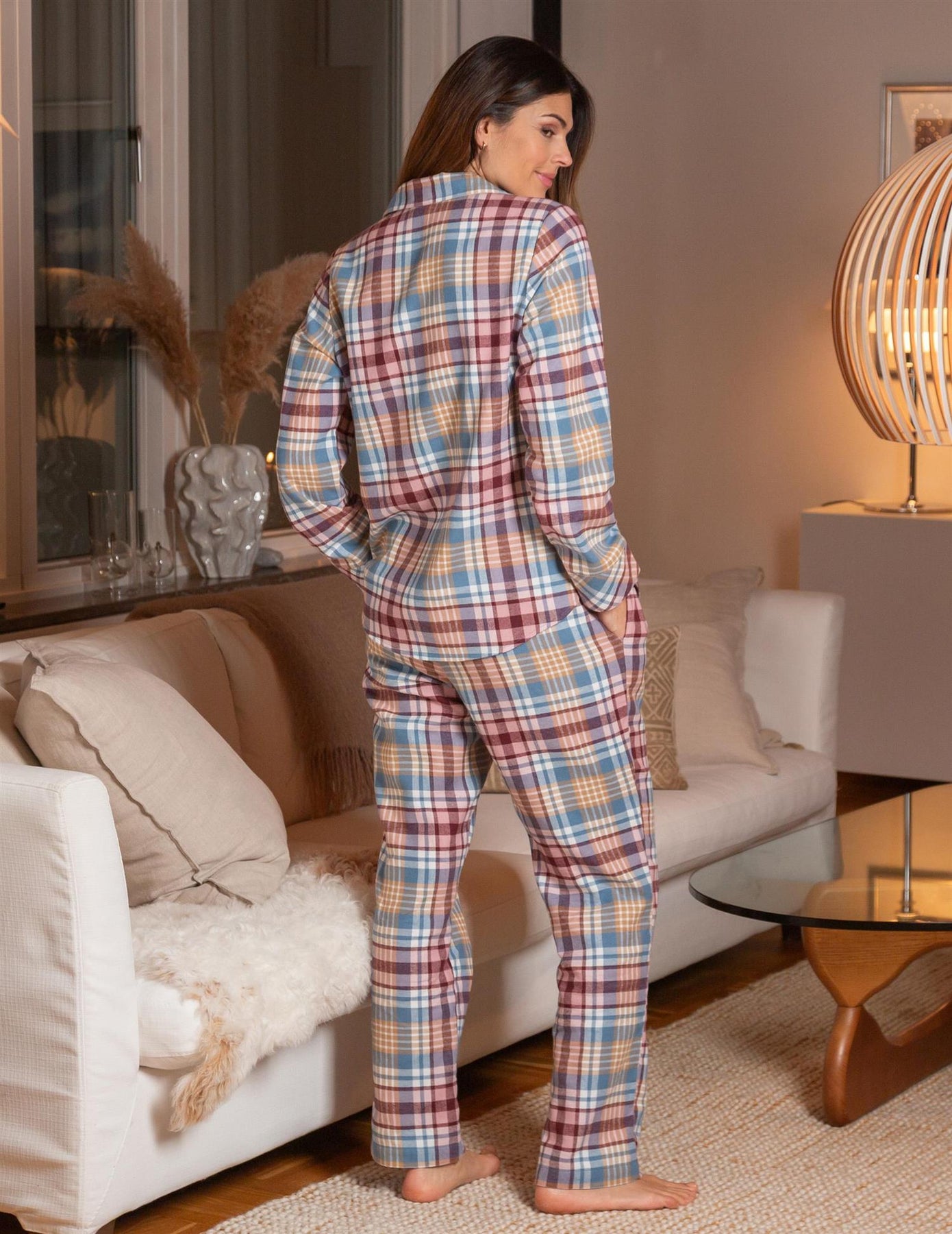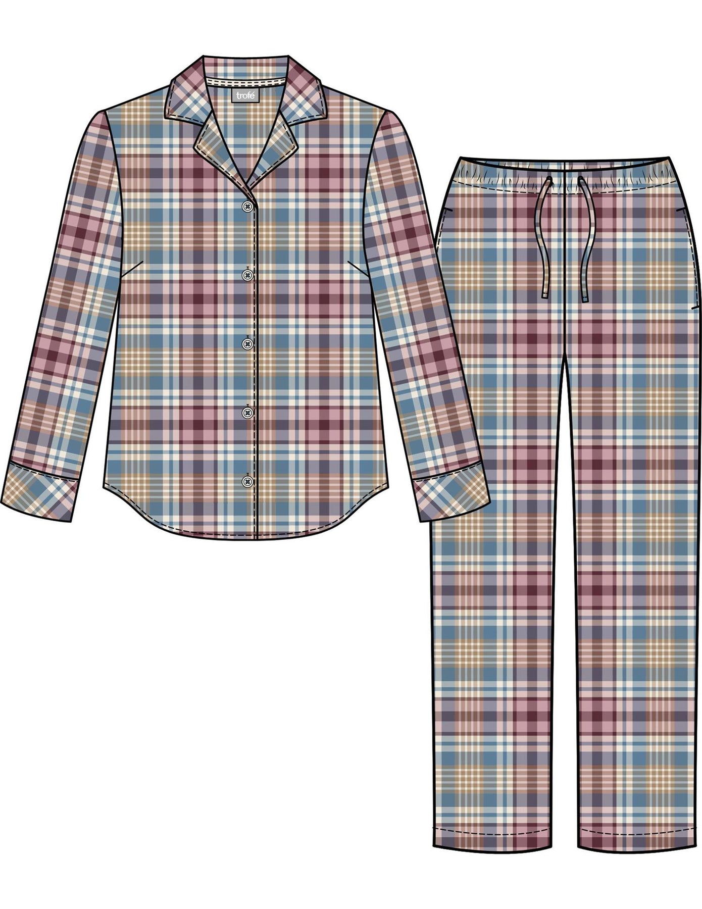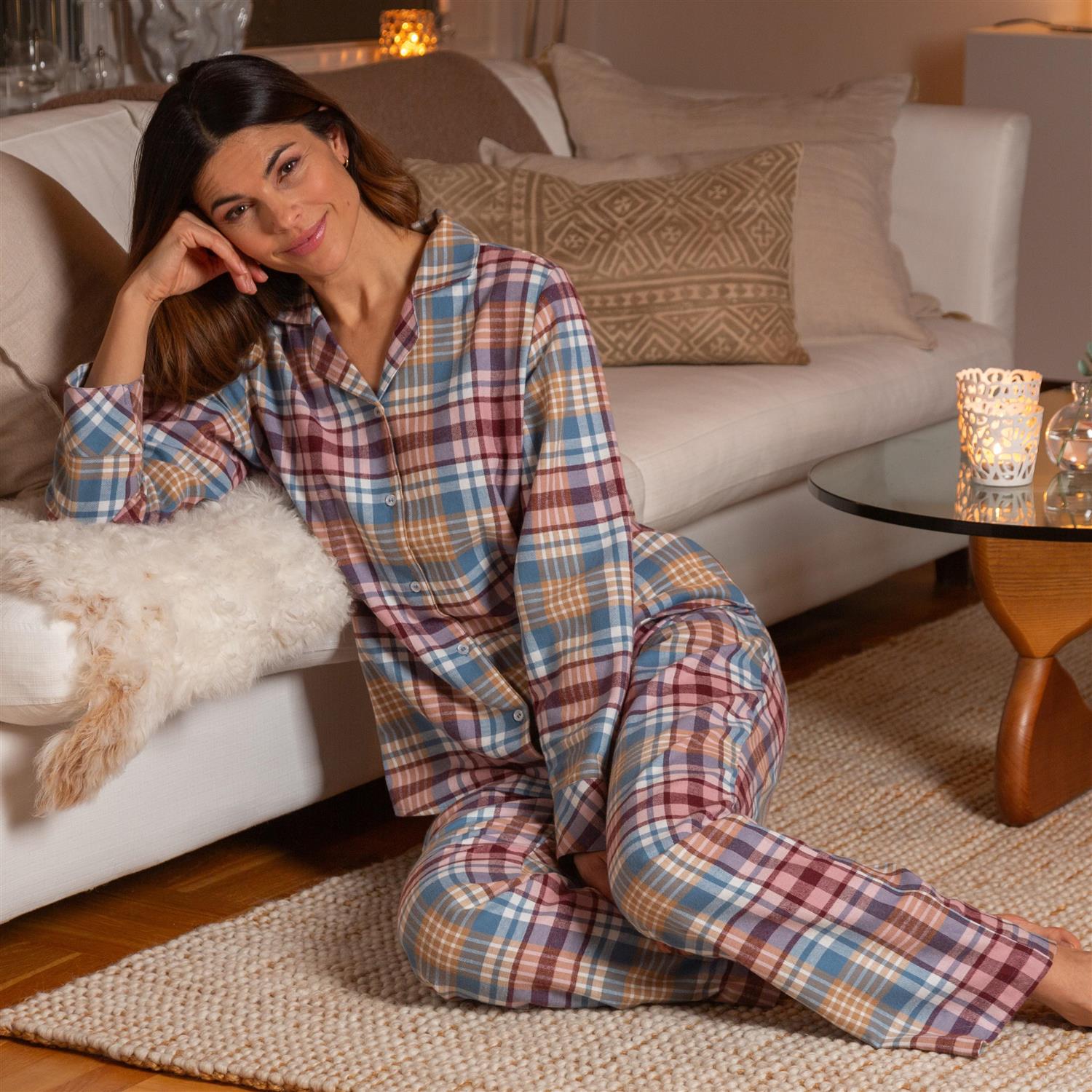Det klassiske rutemønsteret i rosa, vinrød, blå og beige på en frisk offwhite bunn gjør pysjamasen både koselig og elegant – perfekt til kjølige netter og late helgemorgener.