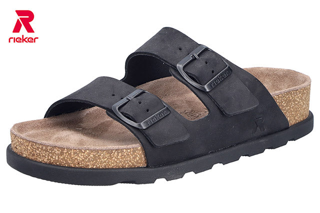 V3190-01 Fantastisk myke slip-in sandaler fra Rieker i skinn i svart er det perfekte tilskuddet til din skogarderobe.